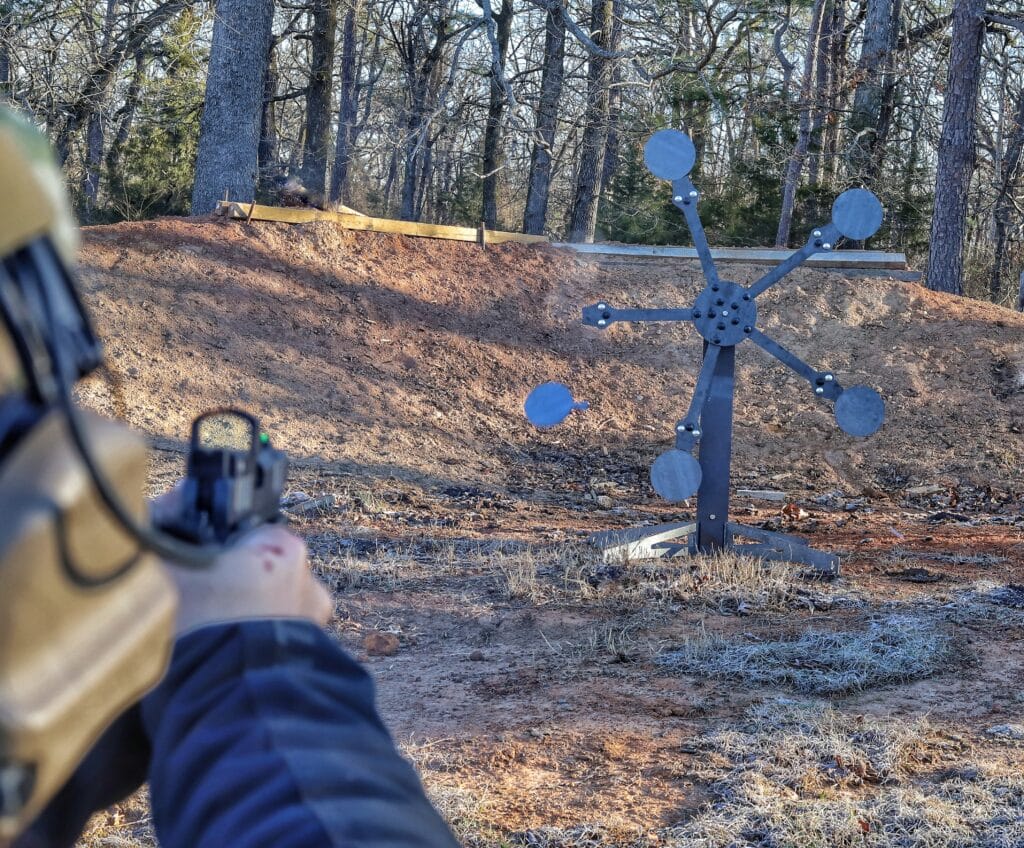 For those new to it, the Texas Star is a reactive steel target system made up of a central hub and five steel paddles mounted on arms. Once the first paddle is shot off, the entire target begins to spin as the balance changes — making each subsequent shot more challenging. It’s an incredible way to practice speed, accuracy, and transition skills — and it’s just plain fun. We even offer a 10 target adapter package for extra challenge and excitement, featuring slightly shorter arms requiring more movement of the firearm, adding an additional challenge.